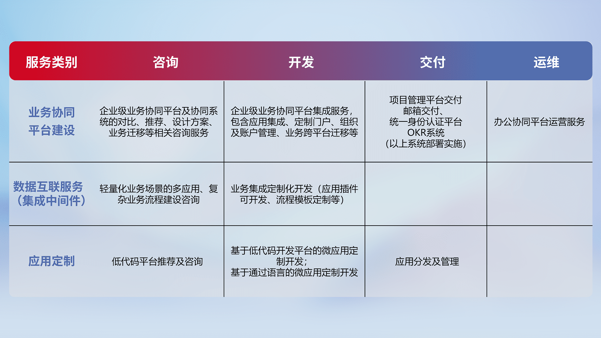 针对钉钉、、、企微、、、IDaas等平台级产品提供产品的规划、、方案、、交付、、、、定制化开发等服务,,,实现如统一协同办公、、、、智能客户服务、、、混合会议管理、、、智能数据查询、、、、等业务场景,,,,实现数字化转型。。