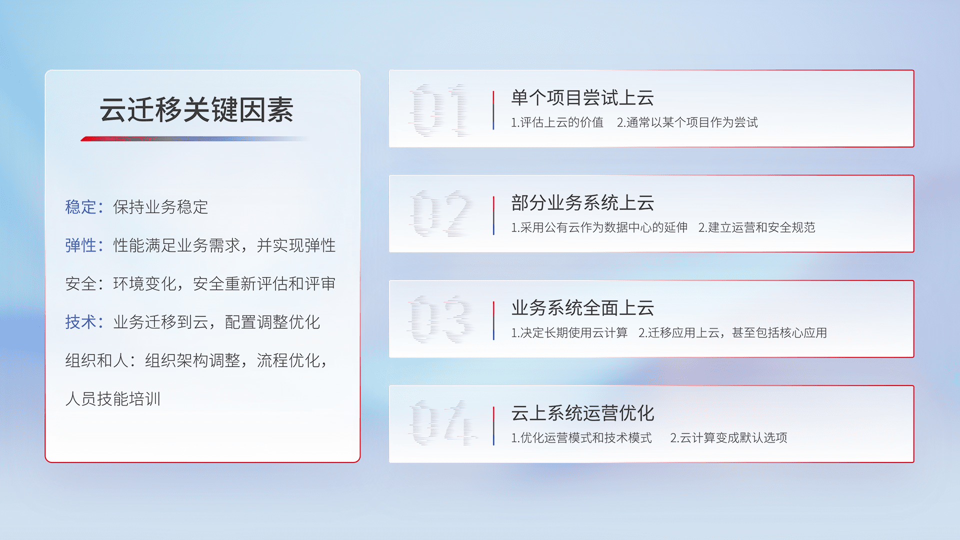 结合实际业务,,,从规划设计、、云平台选型、、、、云原生改造、、数据迁移、、集成交付,,,迁移全过程为客户识别最佳上云路径,,,,做好风险识别管理,,,设计网络架构、、身份权限、、、安全审计合规、、、、操作审计、、、、日志审计、、、、监控告警策略、、多站点容灾设计等,,,,对云上基础设施进行整体规划,,,,提升IT治理水平,,以满足弹性、、、高可用、、、、高性能的需求。。。。