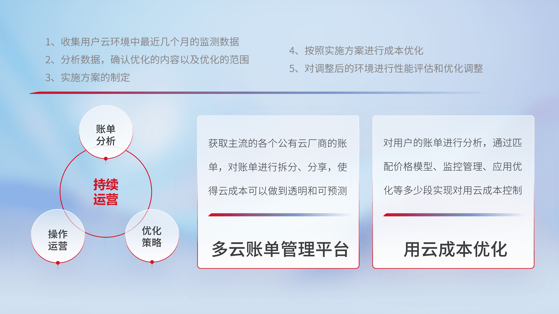 通过多云纳管,,,以统一的资源数据模型把客户的云资源进行抽象和封装,,进而实现对多云资源的统一操作,,保障云资源管理的可靠性、、稳定性与可用性。。。。量身定制化运维内容,,,配置、、开发运维、、、、补丁管理、、、备份、、、监控、、、认证和访问管理、、审计和日常巡检等,,,保障在用云过程中的可靠度,,稳定度以及高可用率。。。。